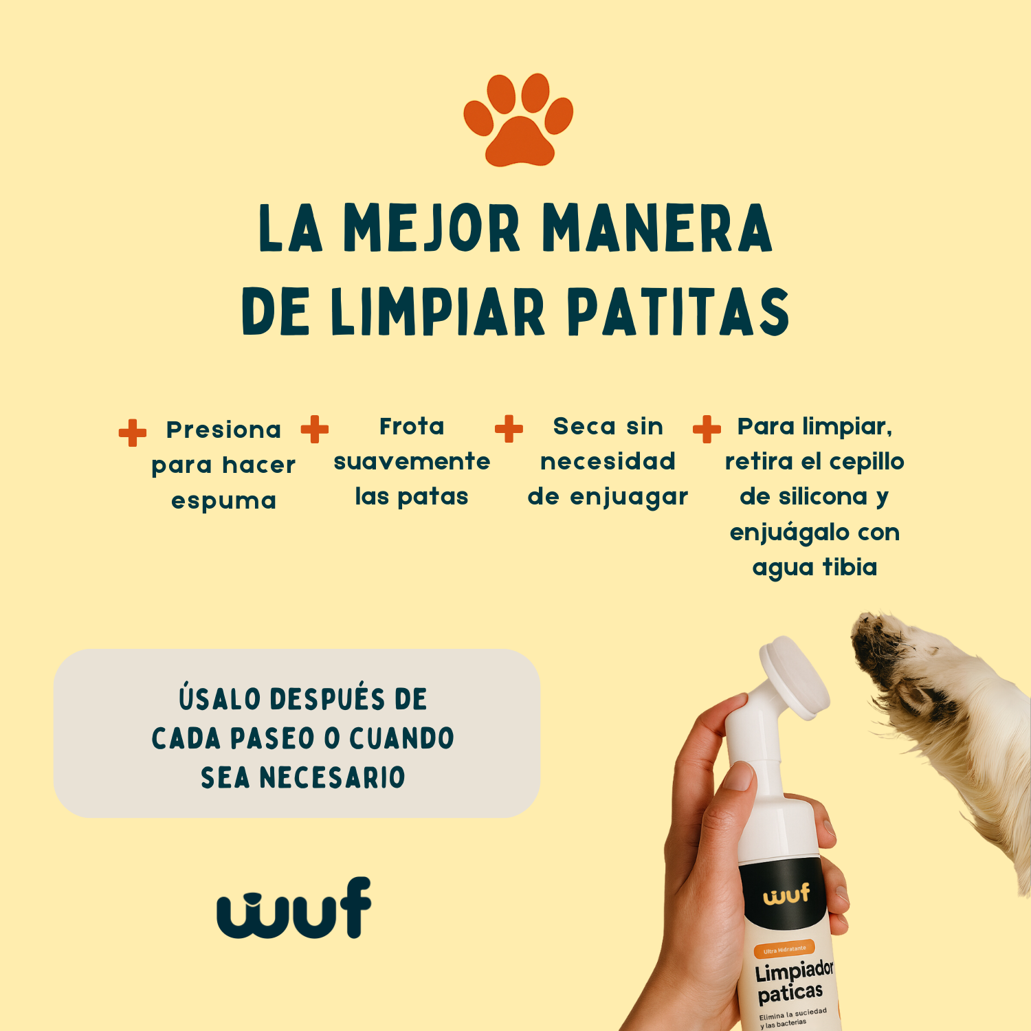Limpia las patas sucias de tu peludo con el limpiador espumoso sin enjuague de Wuf. Las cerdas de silicona suave te permiten entrar en lugares difíciles de alcanzar, mientras que la espuma ayuda a remover la suciedad de las patas o pelo de tu mascota. El limpiador, con ingredientes de origen vegetal, no elimina los aceites naturales en las almohadillas de las patas o la piel, dejando las patas de tu mascota limpias, desodorizadas e hidratadas.