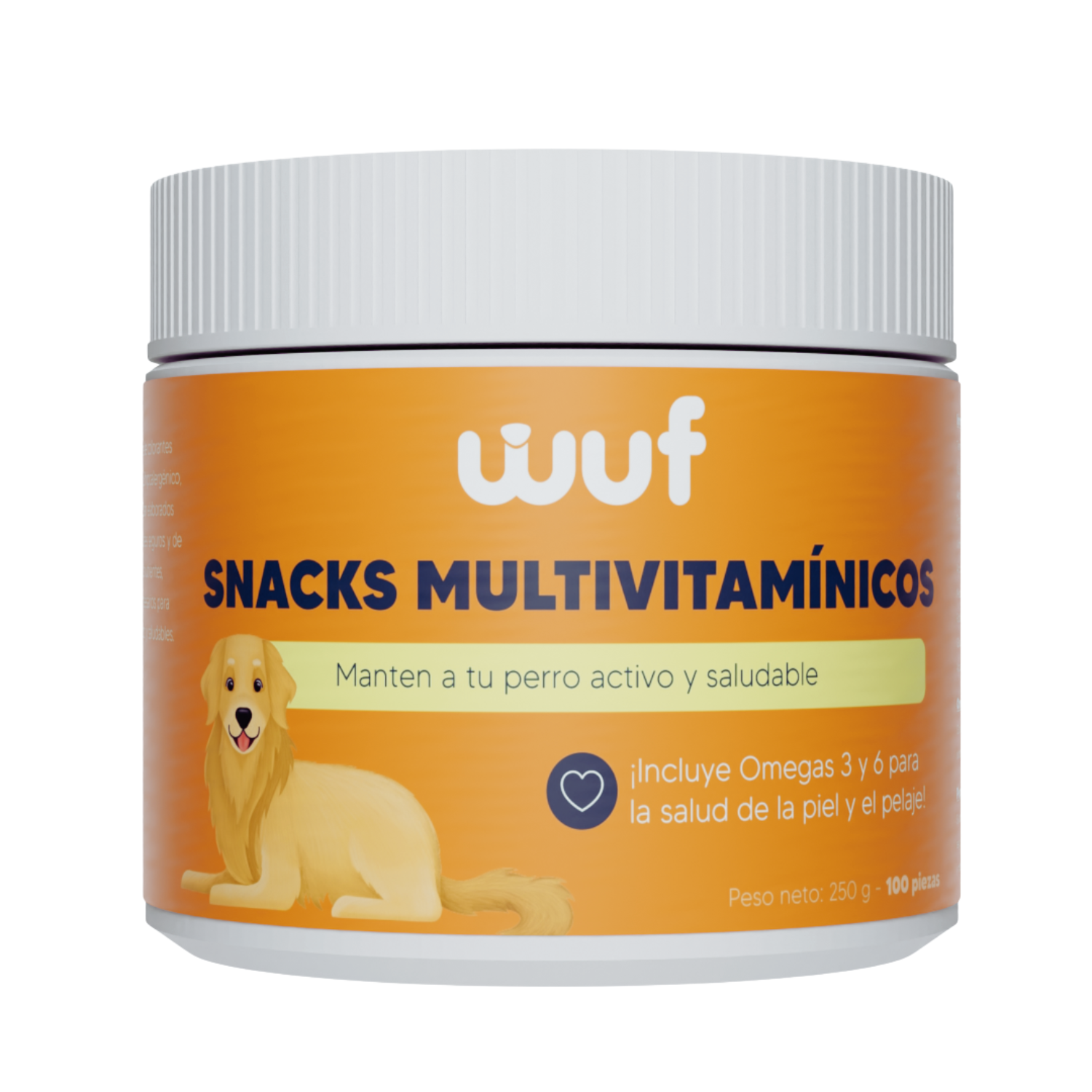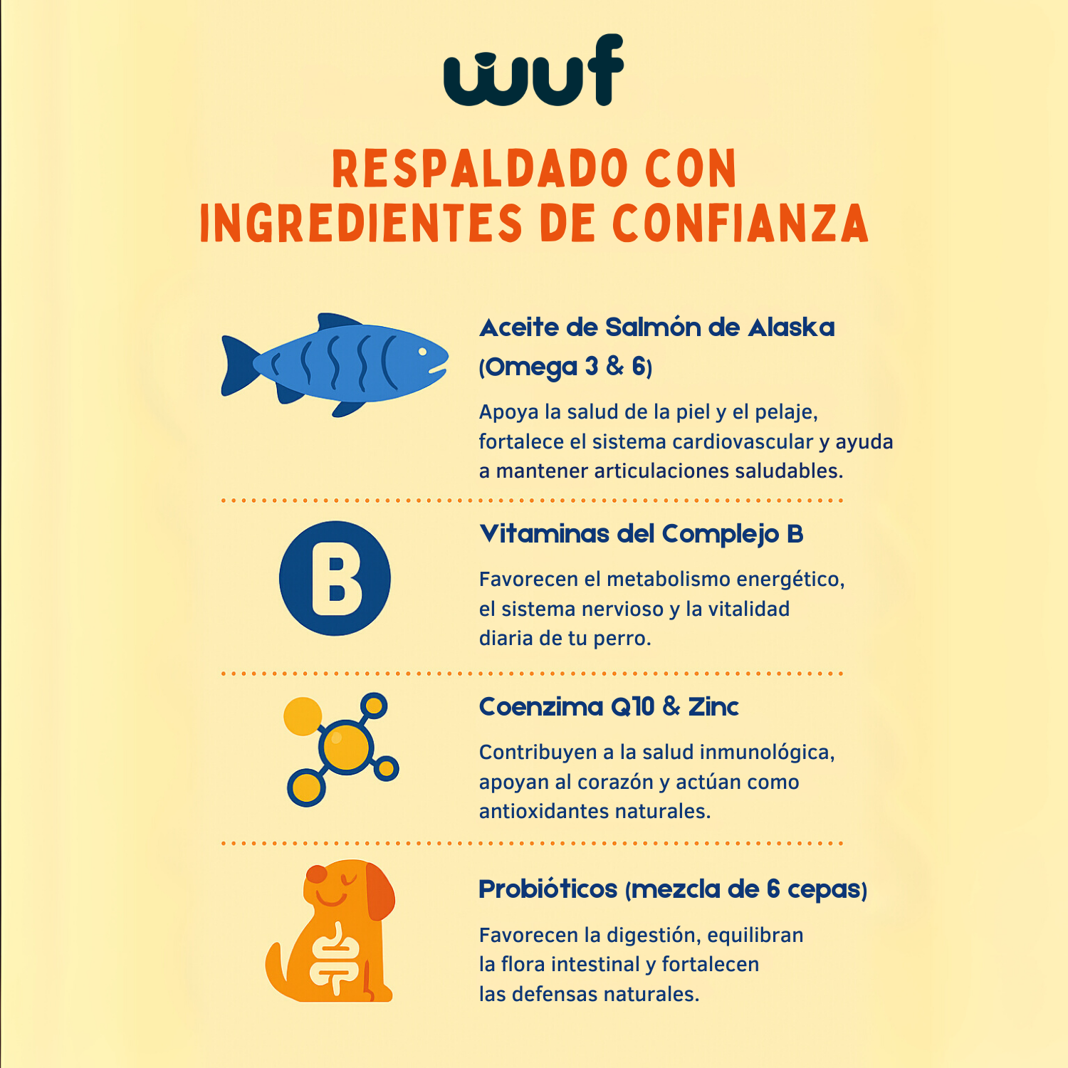 Mantén a tu perro activo, fuerte y lleno de energía con nuestros Snacks Multivitamínicos WUF. Cada bocado contiene más de 25 nutrientes esenciales, incluyendo omegas 3 y 6, antioxidantes y vitaminas que apoyan: